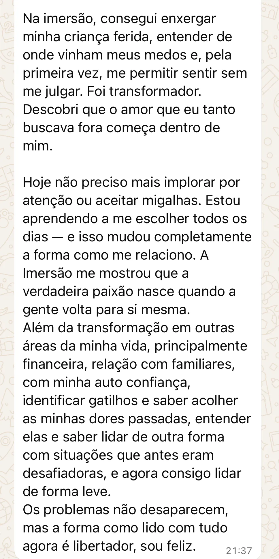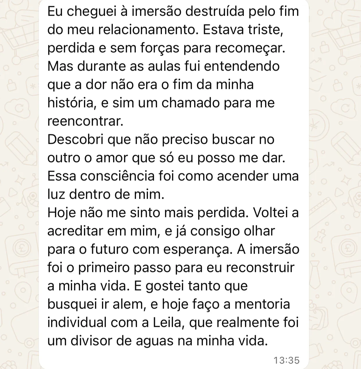 Um acompanhamento exclusivo e online, com duração de quatro meses, feito sob medida para você. Mais do que um processo terapêutico, é um direcionamento completo para elevar sua relação a outro nível olhando para cada detalhe, curando bloqueios ocultos e reprogramando padrões que hoje sabotam sua felicidade. Leila estará de mãos dadas com você em cada passo desta jornada de transformação.
